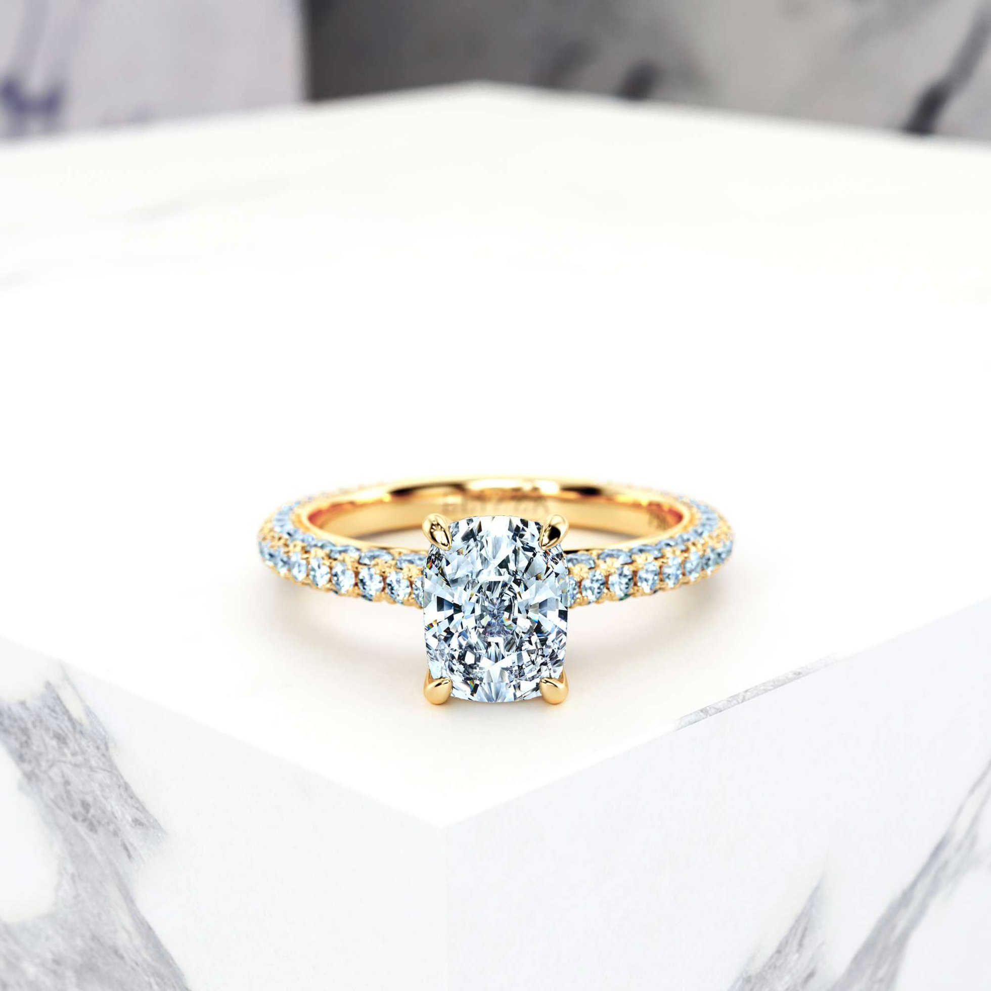 Eine Augenweide mit seiner grazilen 4-Krallenfassung für den zentralen Diamanten. Das minutiös mit Handarbeit gefertigte Band mit 3 Reihen voller Diamanten verschmälert sich geschmeidig nach unten und erzielt eine äusserst harmonische Erscheinung.