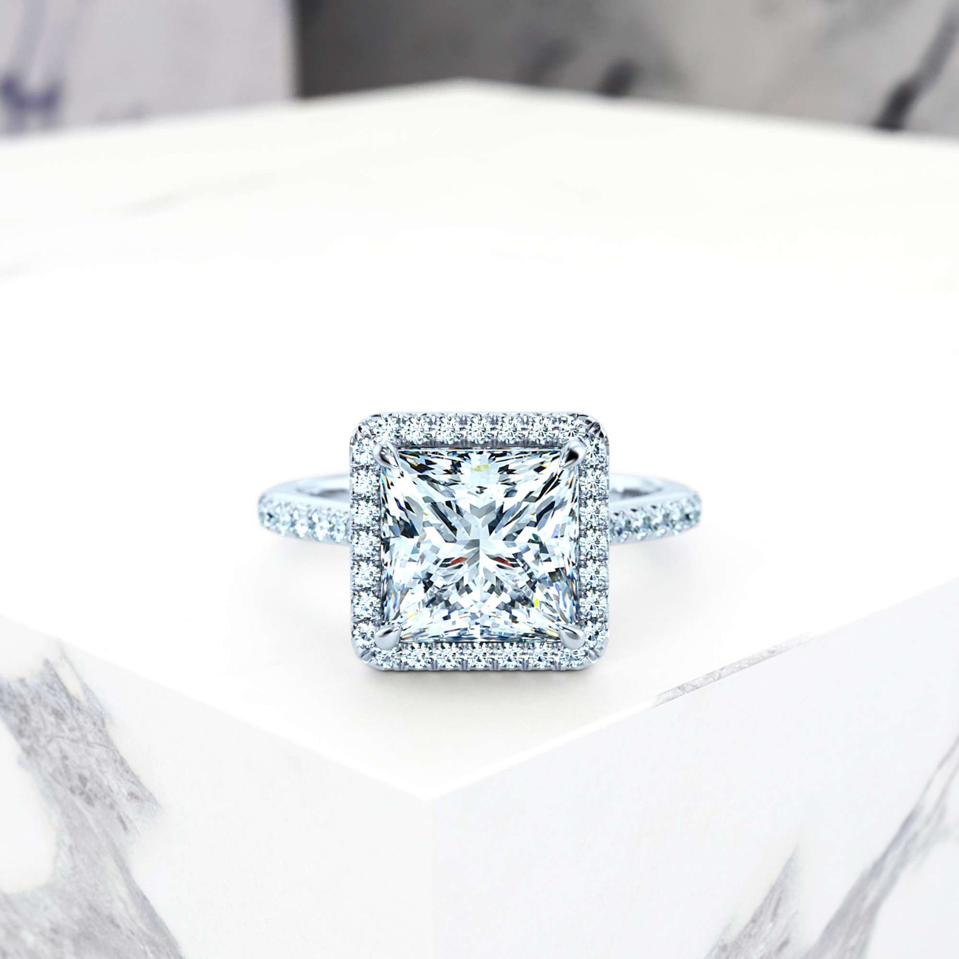 Dieser noble Diamant-Verlobungsring besticht durch seinen feinen, geschmeidigen Zulauf auf den grazilen HALO, der den Hauptstein umsäumt und diesen auf meisterhafte Weise akzentuiert.