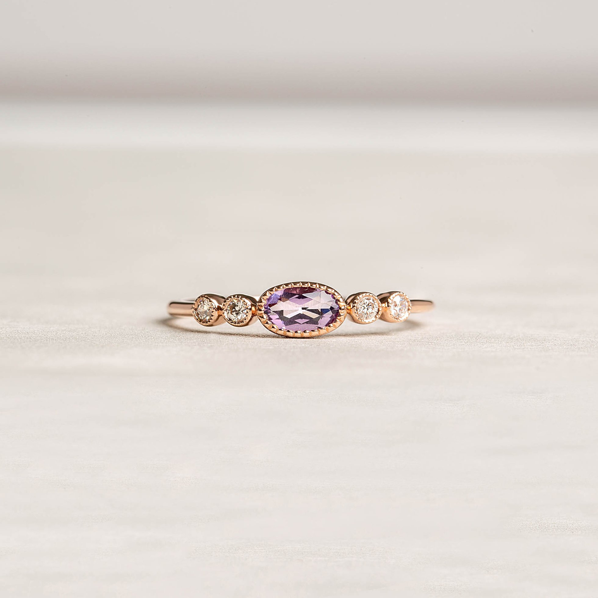 Farbenfroh funkelnd soll er sein? Der Amethyst mit seiner ikonischen violetten Farbe definiert das Zentrum dieses Rings und wird von 4 weissen Pavé-Diamanten gesäumt.