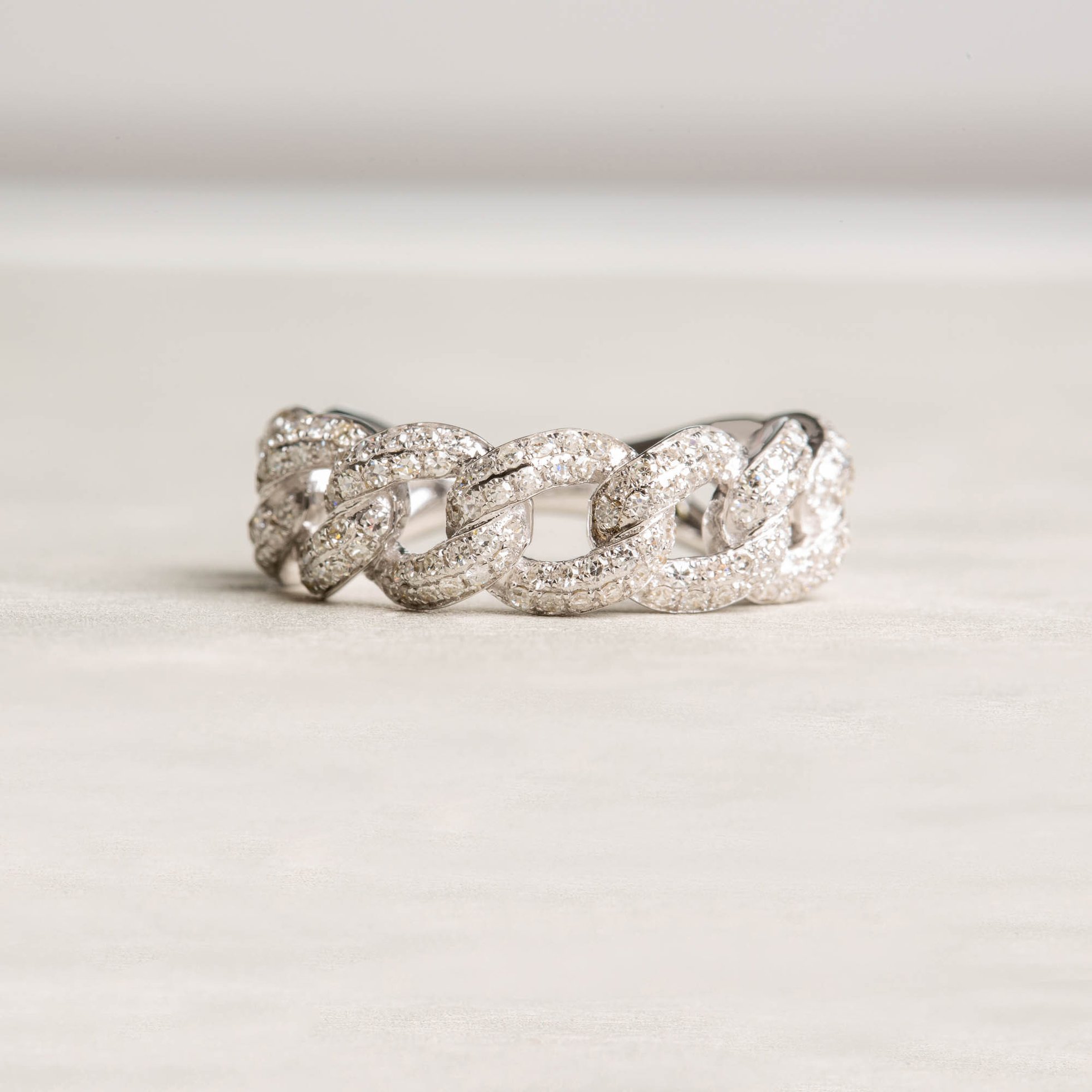 Inspiriert vom Panzerarmband ist dieser wunderschöne Diamantring in Kettenoptik entstanden. Mit seinen 168 Pavé-Diamanten gehört dieser Ring eindeutig zur Oberklasse in seinem Segment und überstrahlt viele andere Ringe mit seinem feurigen Funkeln.