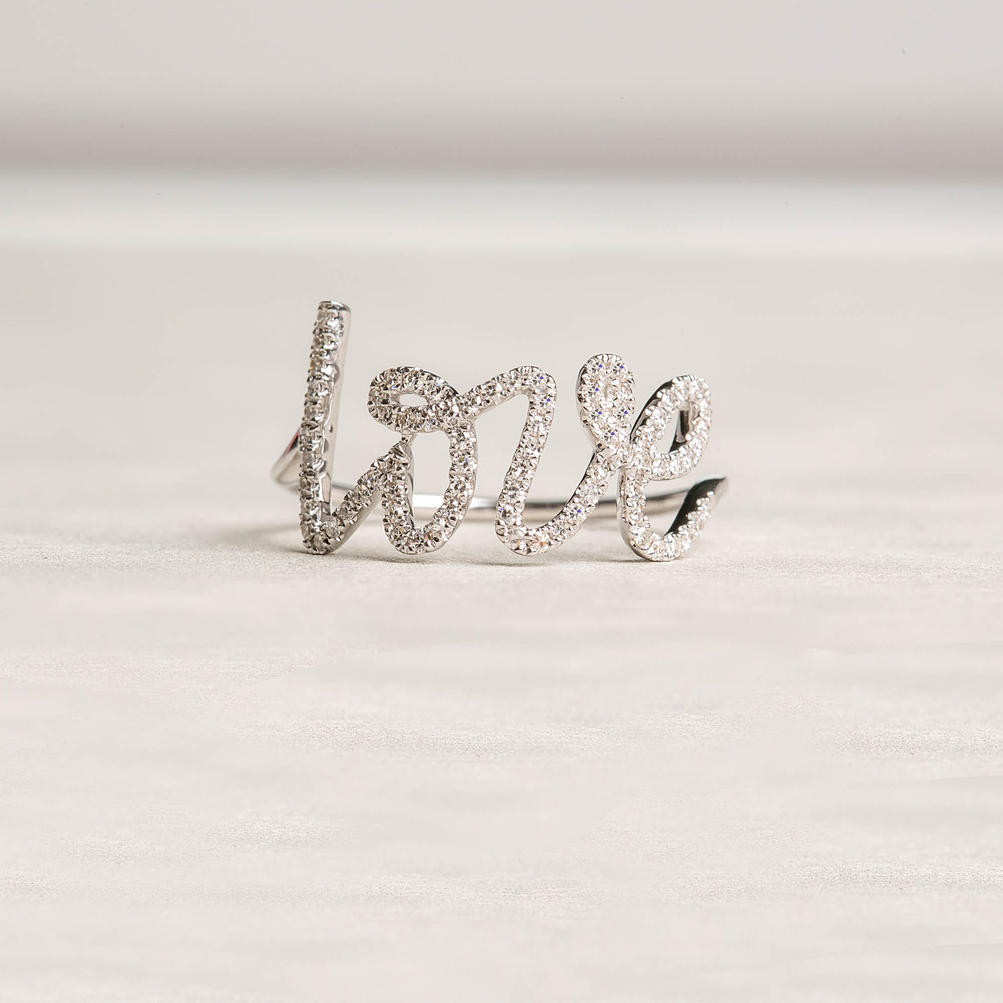 In kursiver Schrift verziert mit vielen, kleinen Pavé-Diamanten ist der "Love"-Ring ein passendes Accessoire für deine Liebste. Lass sie, was sie für dich bedeutet.