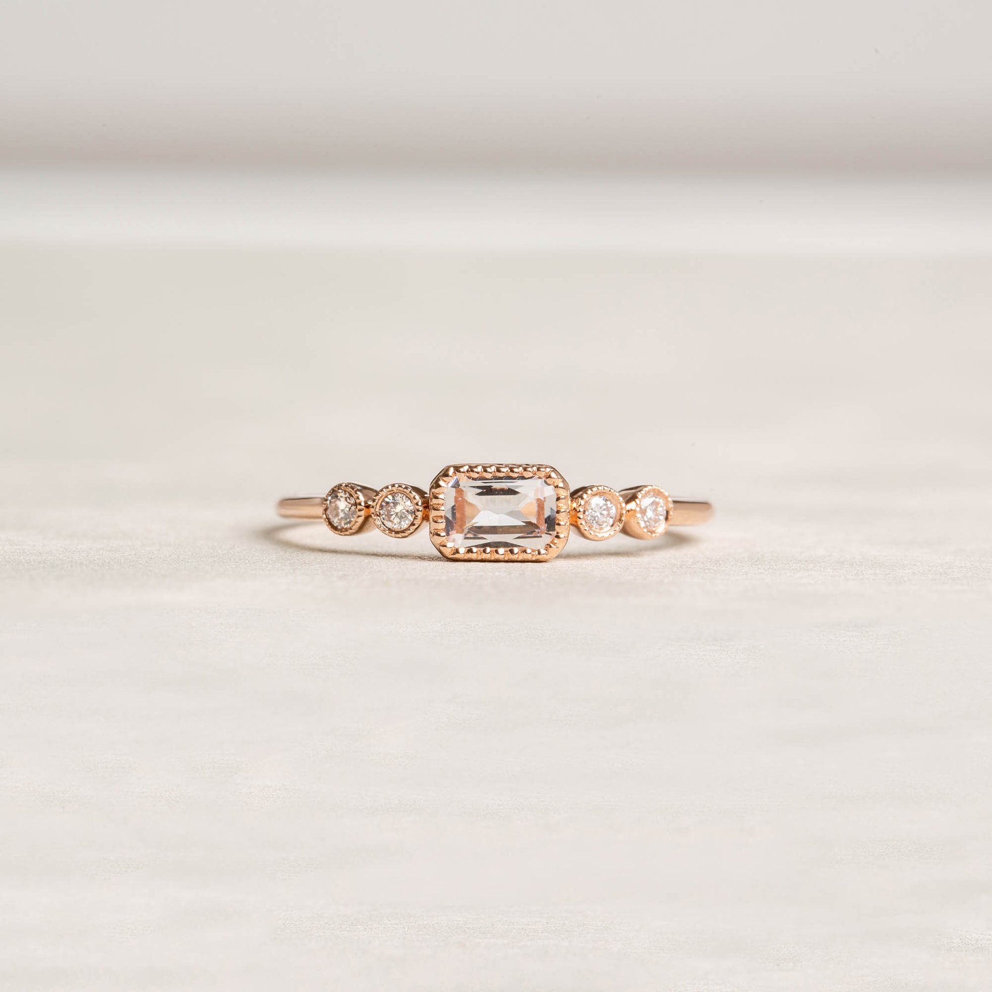 Die vier runden Diamanten an der Seite dieses Diamantrings dienen als Rahmen für das absolute Highlight in der Mitte: Der weisse Topas. In einem durchscheinenden Weiss leuchtet der Topas vor sich hin und zieht so alle Blicke auf sich.