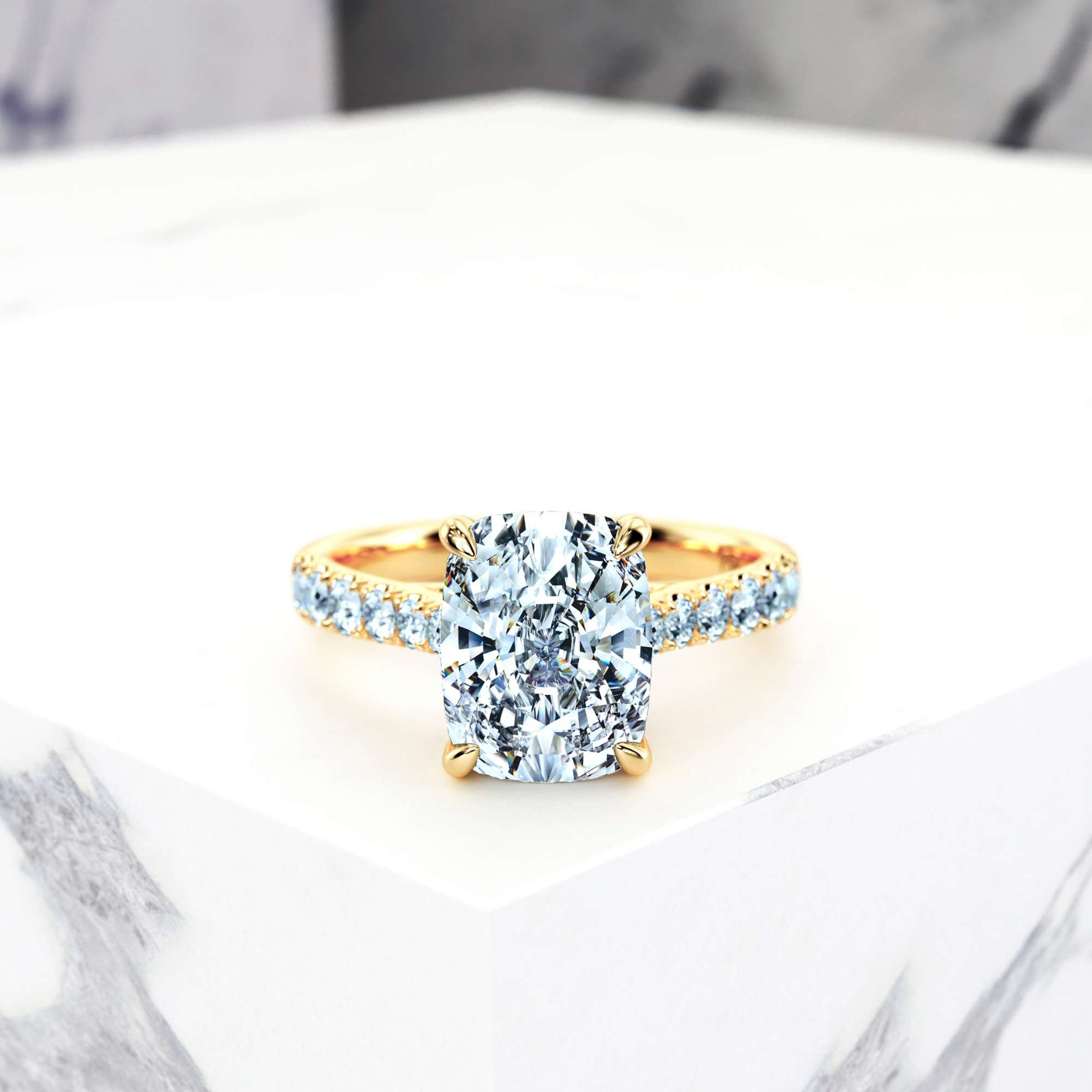 A virtuoso appearance with character - dainty, narrow band, tapering off into a thinning of smaller stones towards the top convey a beautiful aesthetic. The magnificent crown sets off the diamond in an imperial manner.
