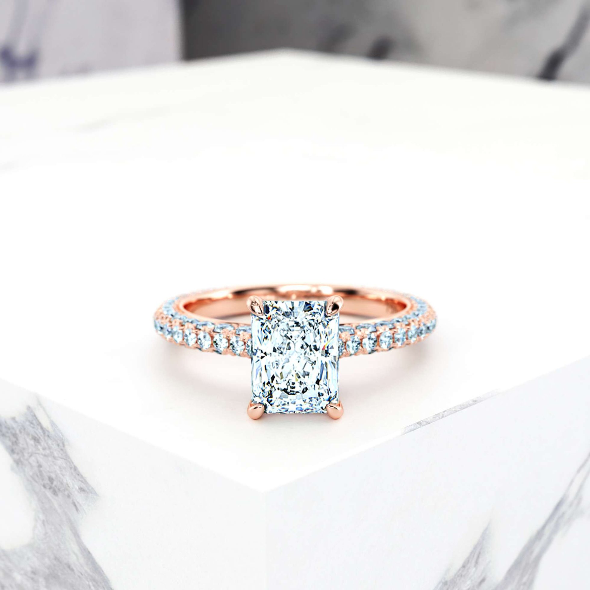 A feast for the eyes with its graceful 4 claw setting for the central diamond. Meticulously handcrafted with 3 rows of full diamonds, the band smoothly narrows downward to achieve an extremely harmonious appearance.