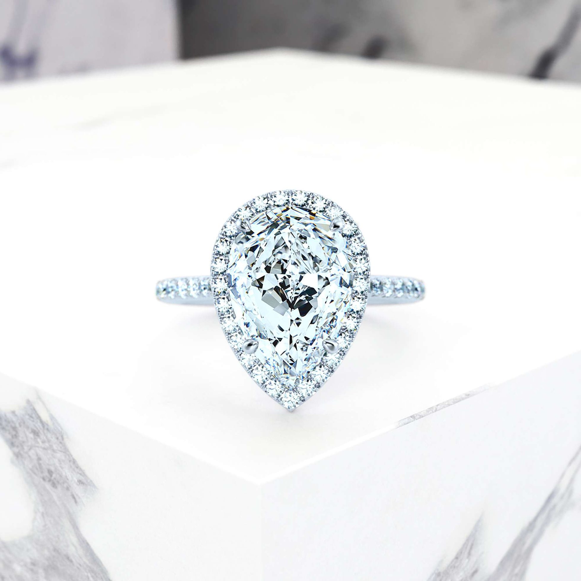 This noble diamond engagement ring captivates with its fine, supple approach to the graceful halo that surrounds the main stone and accentuates it in a simply masterful way.