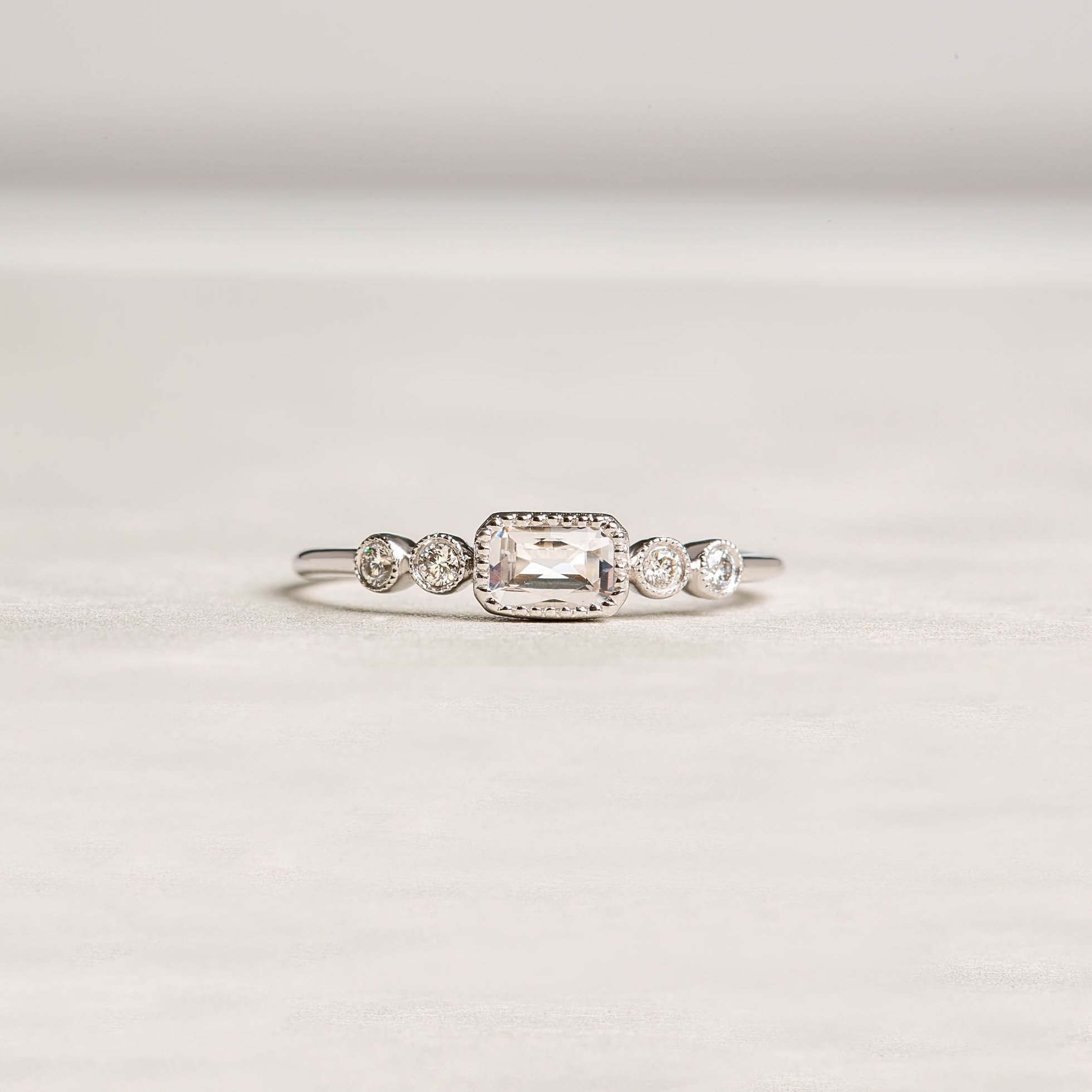 The four round diamonds on the side of this diamond ring serve as a frame for the absolute highlight in the center: The white topaz. In a translucent white, the topaz shines in front of itself and thus attracts all eyes.