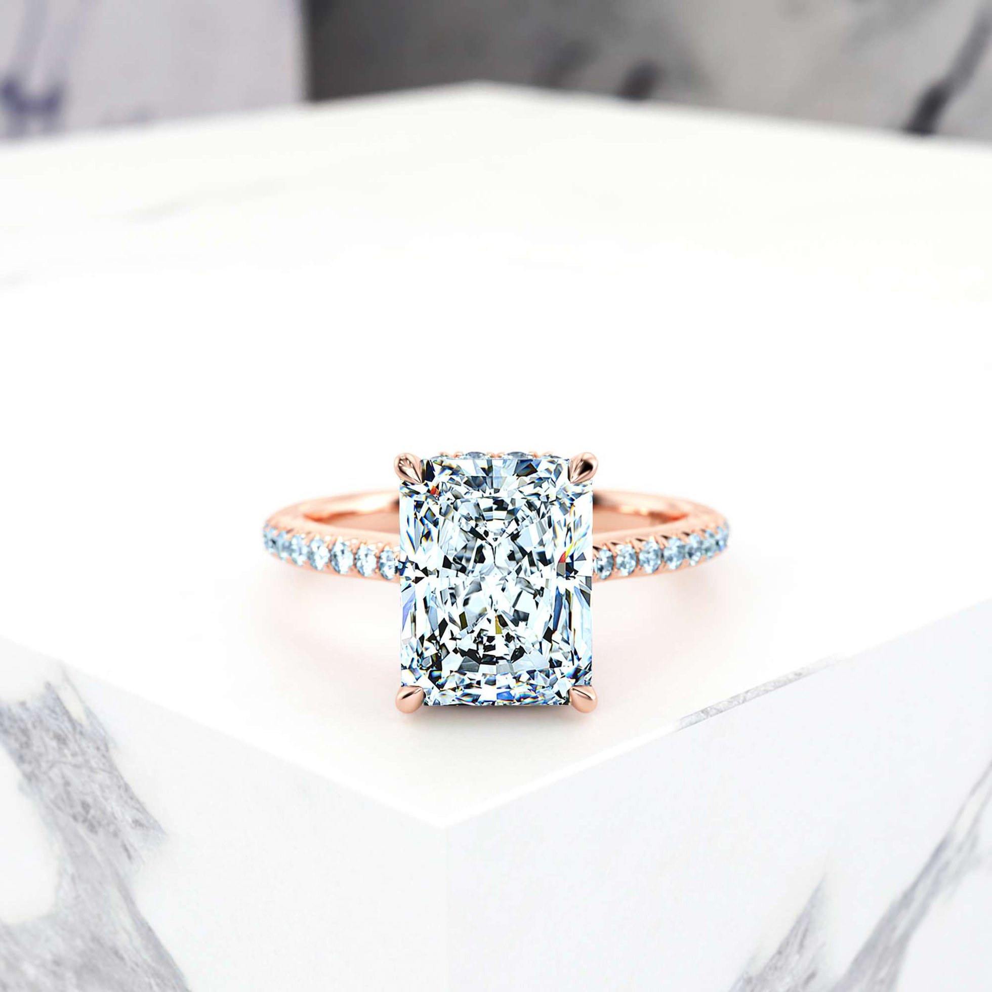 Magnificence choisie par un halo caché autour du diamant central - Les diamants latéraux sertis tout en bas donnent un éclat éblouissant, tout en bas de la bague dépasse un lacet filigrane. Les quatre anses en forme de griffes complètent ce chef-d'œuvre.