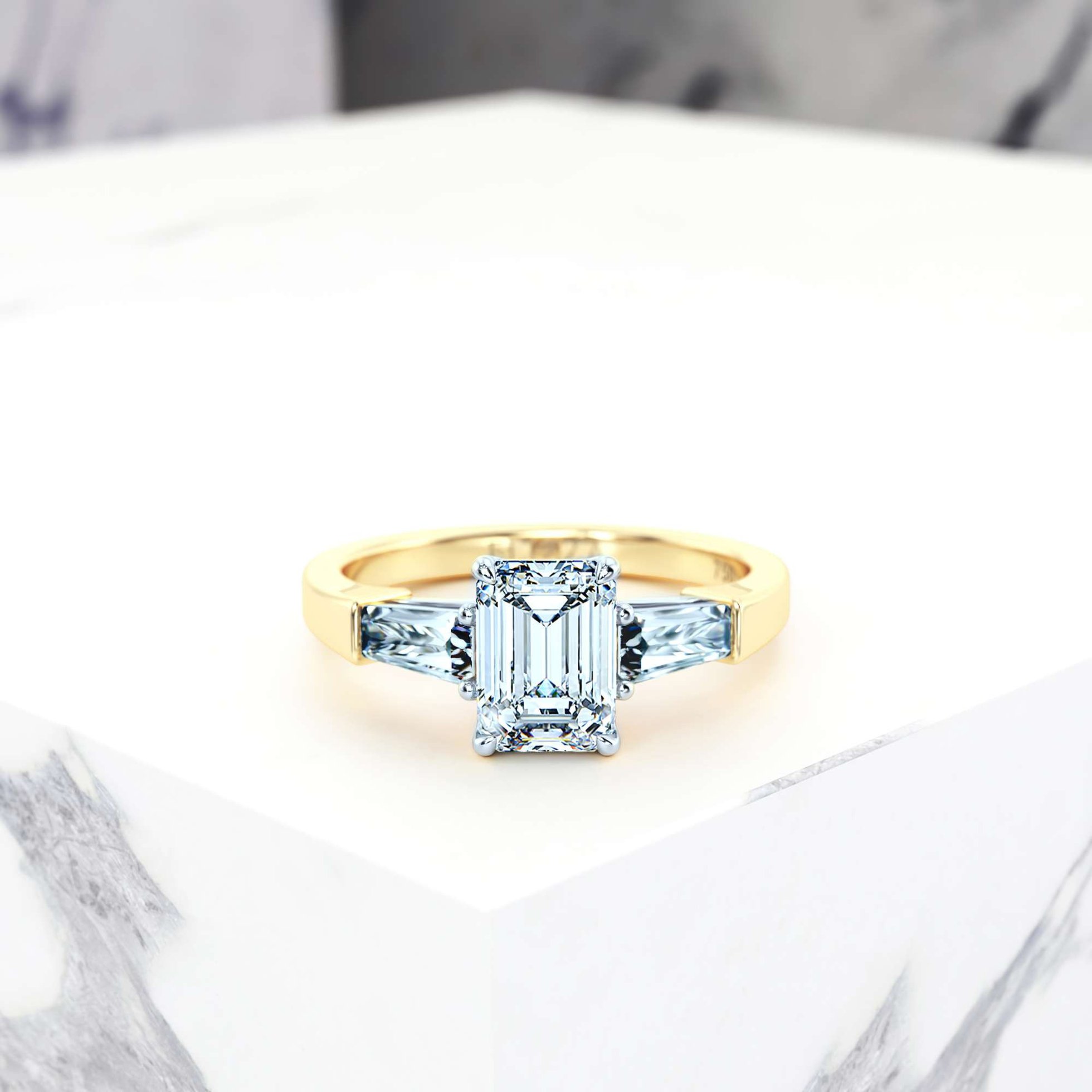 Flanquant le diamant central taille émeraude, deux diamants baguettes se tiennent comme des compagnons inébranlables, ajoutant leur éclat unique à l'histoire qui se déroule. L'Emma Emerald est plus qu'une bague, c'est un témoignage de la profondeur et de la richesse d'un amour durable.
