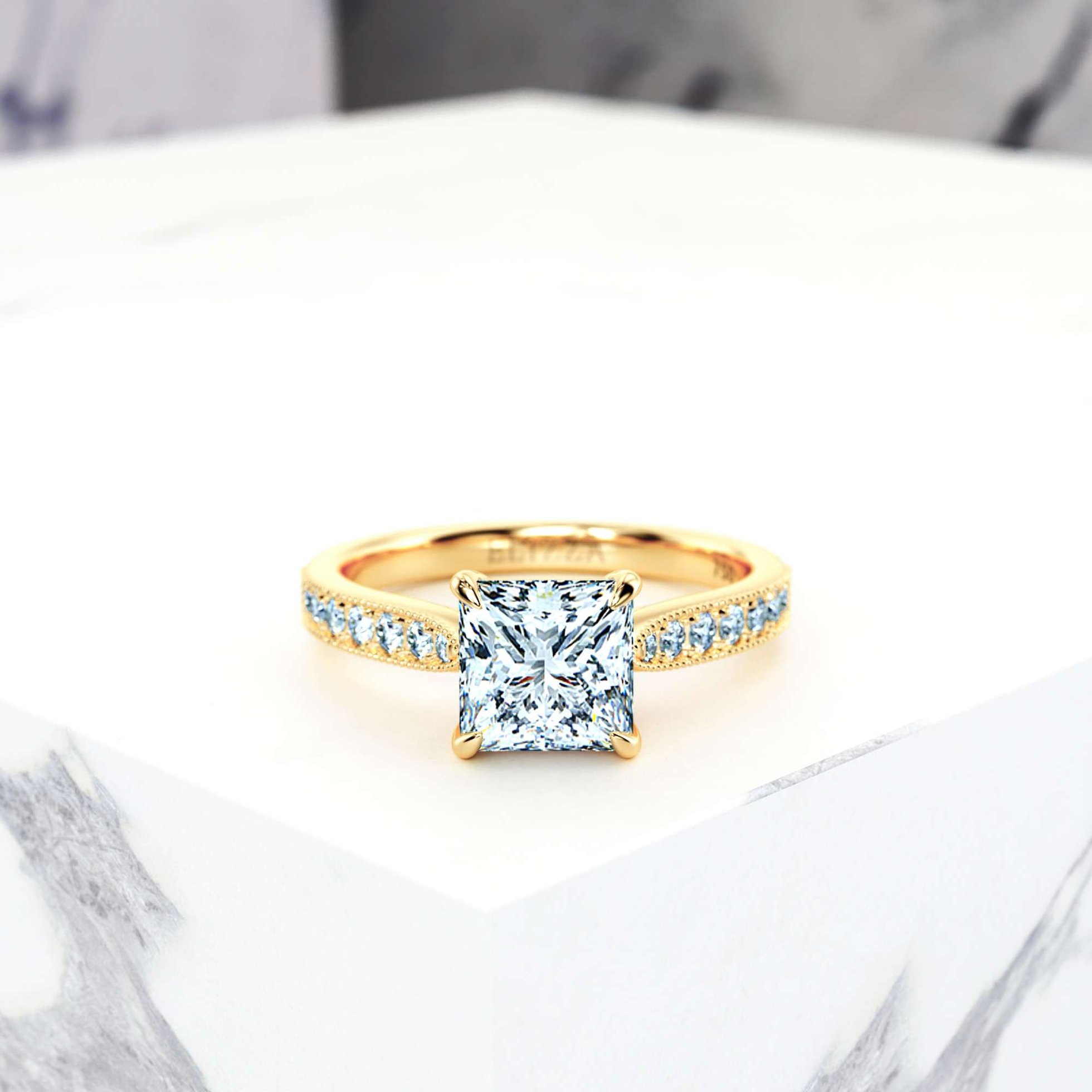 Un magnifique orchestre, caractérisé par l'accentuation des nobles diamants d'épaulement et l'approche époustouflante de la noble pierre principale de taille princesse - le tout complété par l'ornement milgrain subtilement conçu. Le résultat est éloquent. Une fête souple pour les yeux, créée méticuleusement juste pour vous.