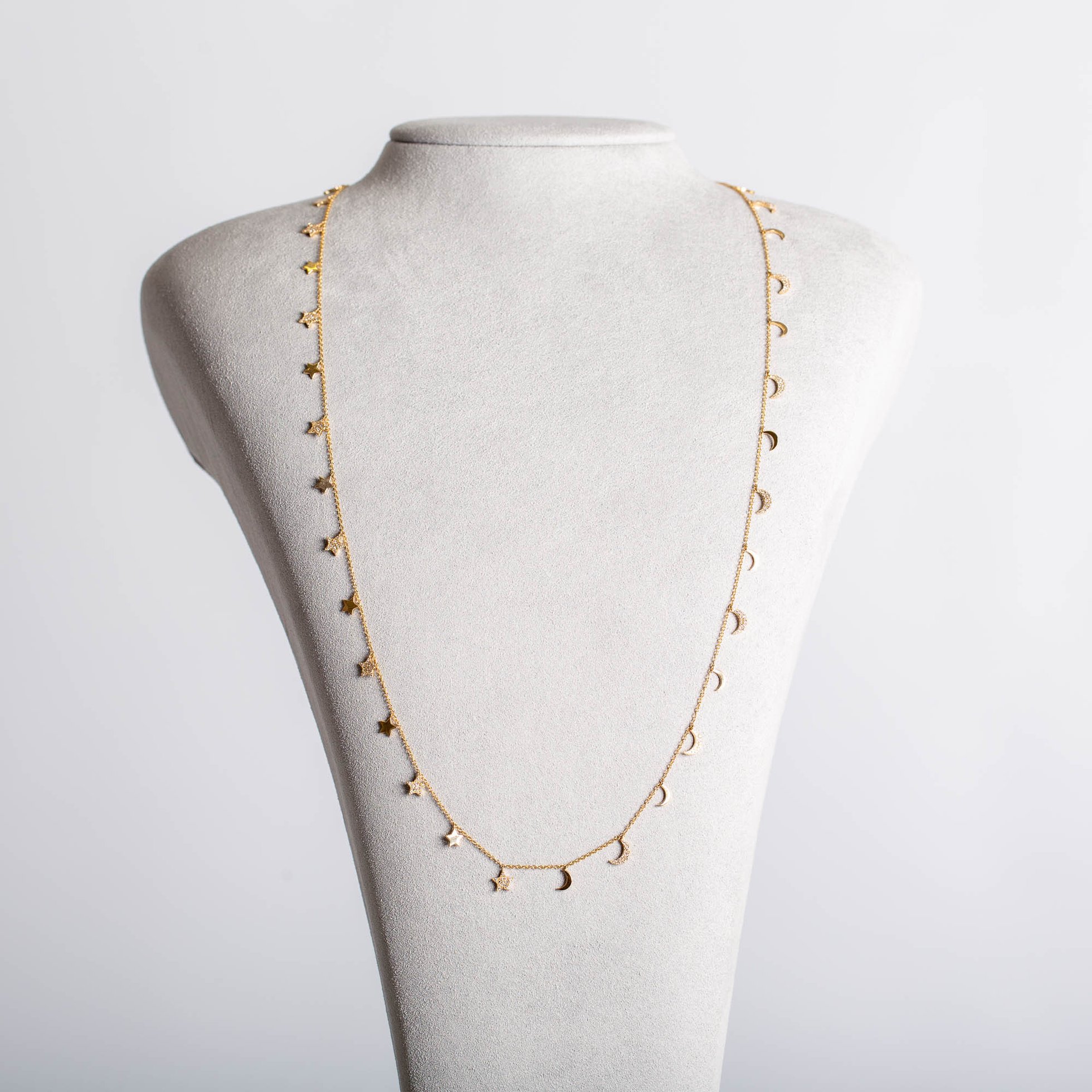 Brillez comme les étoiles et les lunes avec ce magnifique collier de diamants. Doté d'une abondance de pendentifs en forme d'étoile et de lune, chacun magnifiquement orné de diamants étincelants, ce collier est un véritable chef-d'œuvre de joaillerie. Que ce soit pour une occasion spéciale ou comme cadeau significatif, ce collier symbolise la magie et l'émerveillement du ciel nocturne, ce qui en fait une pièce intemporelle qui sera toujours chérie. Laissez-vous séduire par la beauté céleste de ce collier de diamants à couper le souffle.