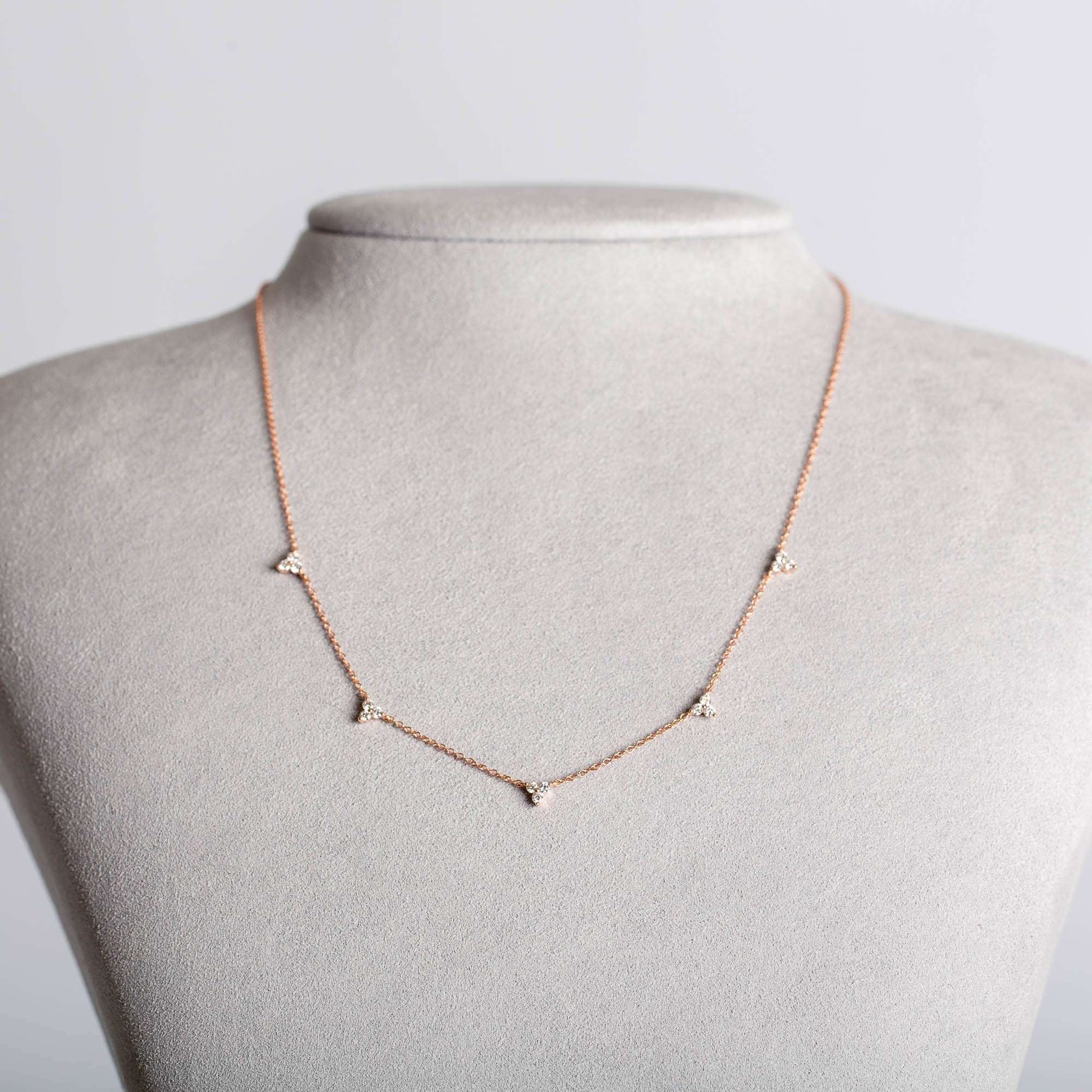 Voici un superbe collier de diamants comprenant 5 pendentifs en forme de triangle, chacun d'entre eux étant orné de 3 diamants éblouissants. Le design simpliste met en valeur la brillance des diamants et ajoute une touche de sophistication à toute tenue. Parfait pour les occasions spéciales ou comme cadeau pour quelqu'un de spécial, ce collier de diamants est une pièce intemporelle qui sera chérie pour les années à venir.