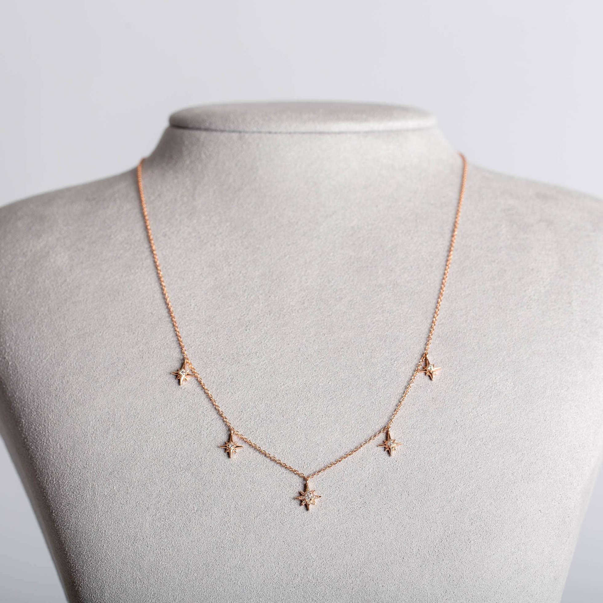 Faites une déclaration significative avec ce magnifique collier de diamants comprenant 5 pendentifs en forme d'étoile. Chaque étoile symbolise l'espoir, l'inspiration et l'orientation, ce qui en fait un cadeau parfait pour quelqu'un de spécial ou un moyen de se faire plaisir. Les diamants étincelants ajoutent une touche de glamour et transforment le collier en un bijou qui sera chéri pendant des années. Embrassez le pouvoir des étoiles avec ce magnifique collier de diamants.