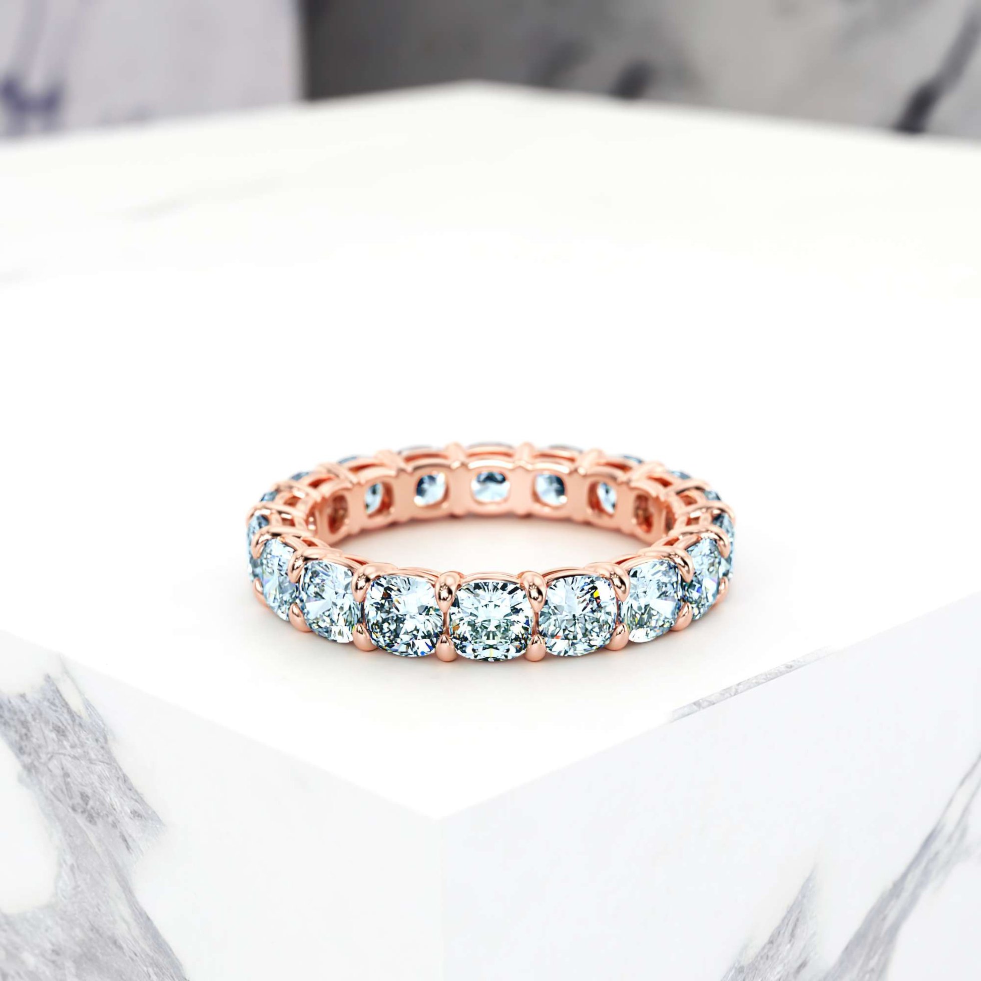 Cette alliance éternelle est un symbole étonnant d'amour et d'engagement éternels. L'anneau continu présente des diamants carrés de taille coussin sertis dans d'élégantes corbeilles et maintenus en place par des griffes. Chaque diamant a été soigneusement sélectionné pour sa brillance, son feu et son scintillement exceptionnels, et est serti de manière experte pour garantir une brillance et une durabilité maximales.